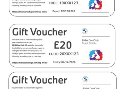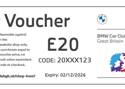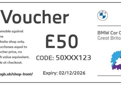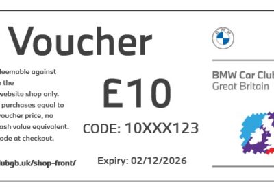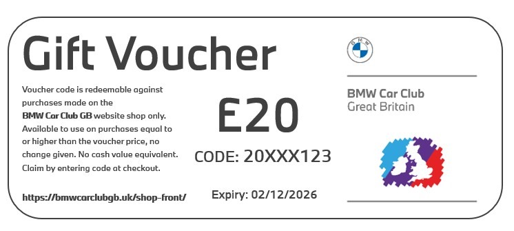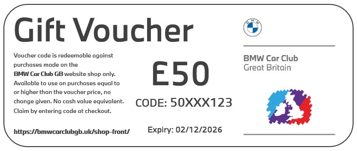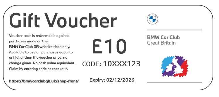 Redeemable across the BMW Car Club GB online shop. Available to use against any merchandise, track day tickets or clothing for sale in the shop.