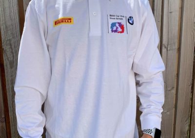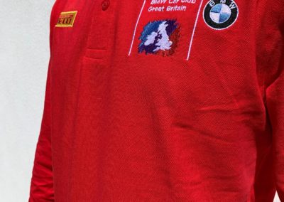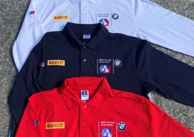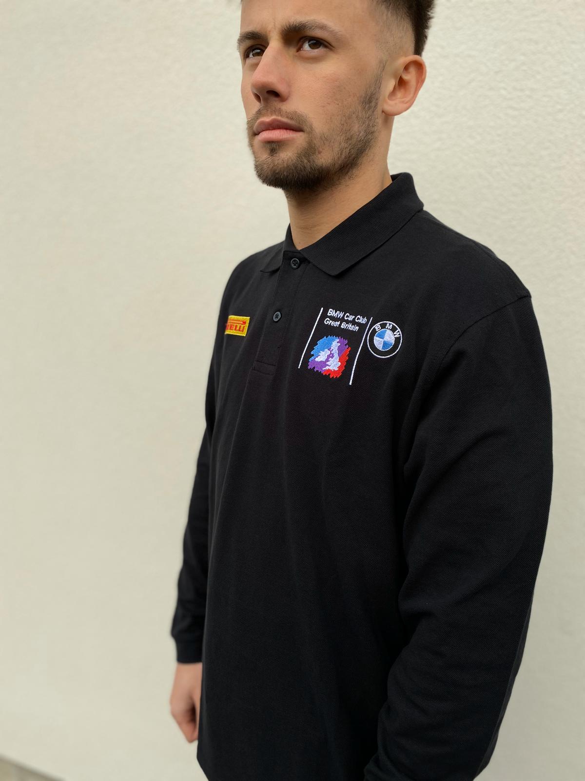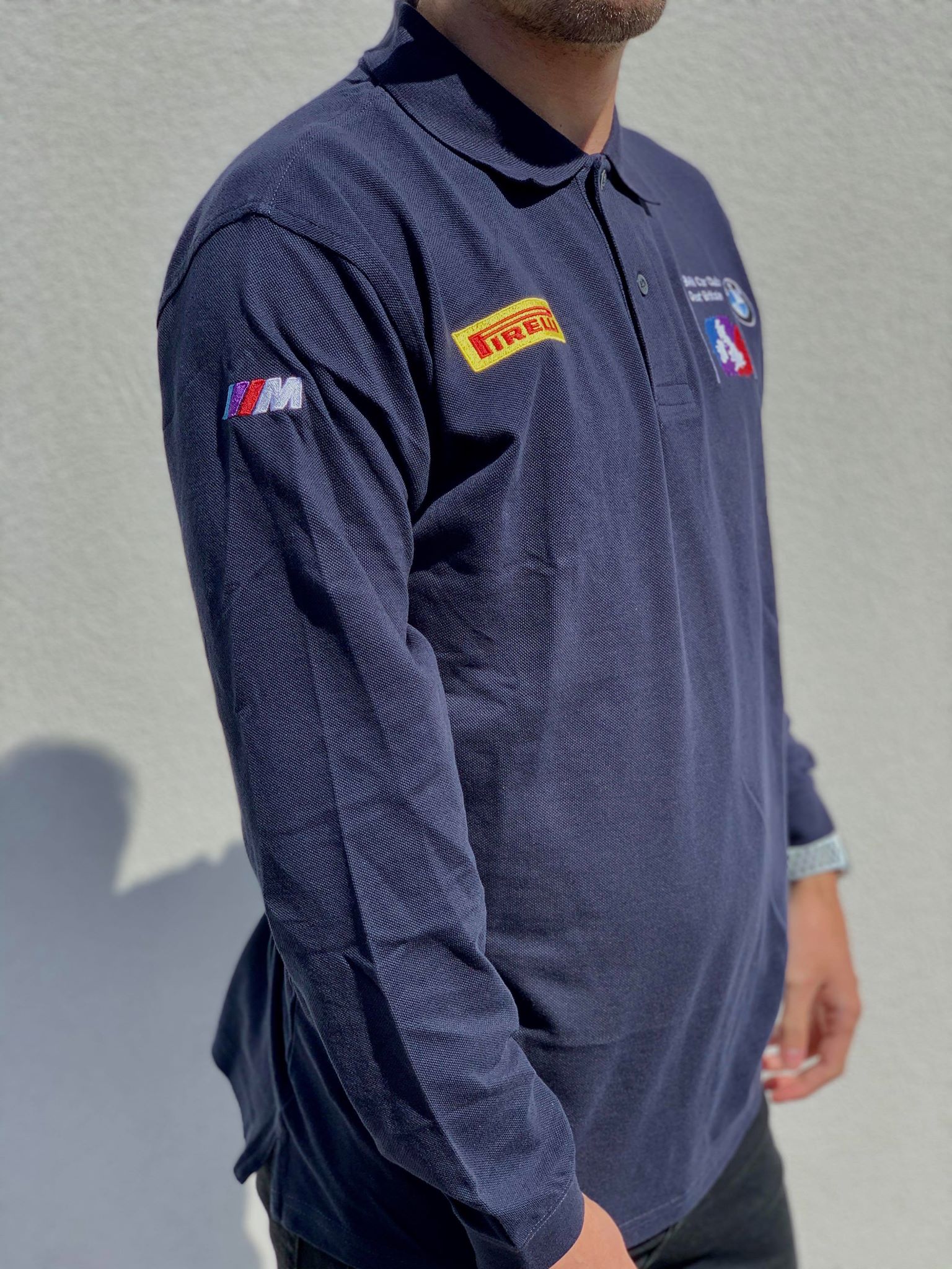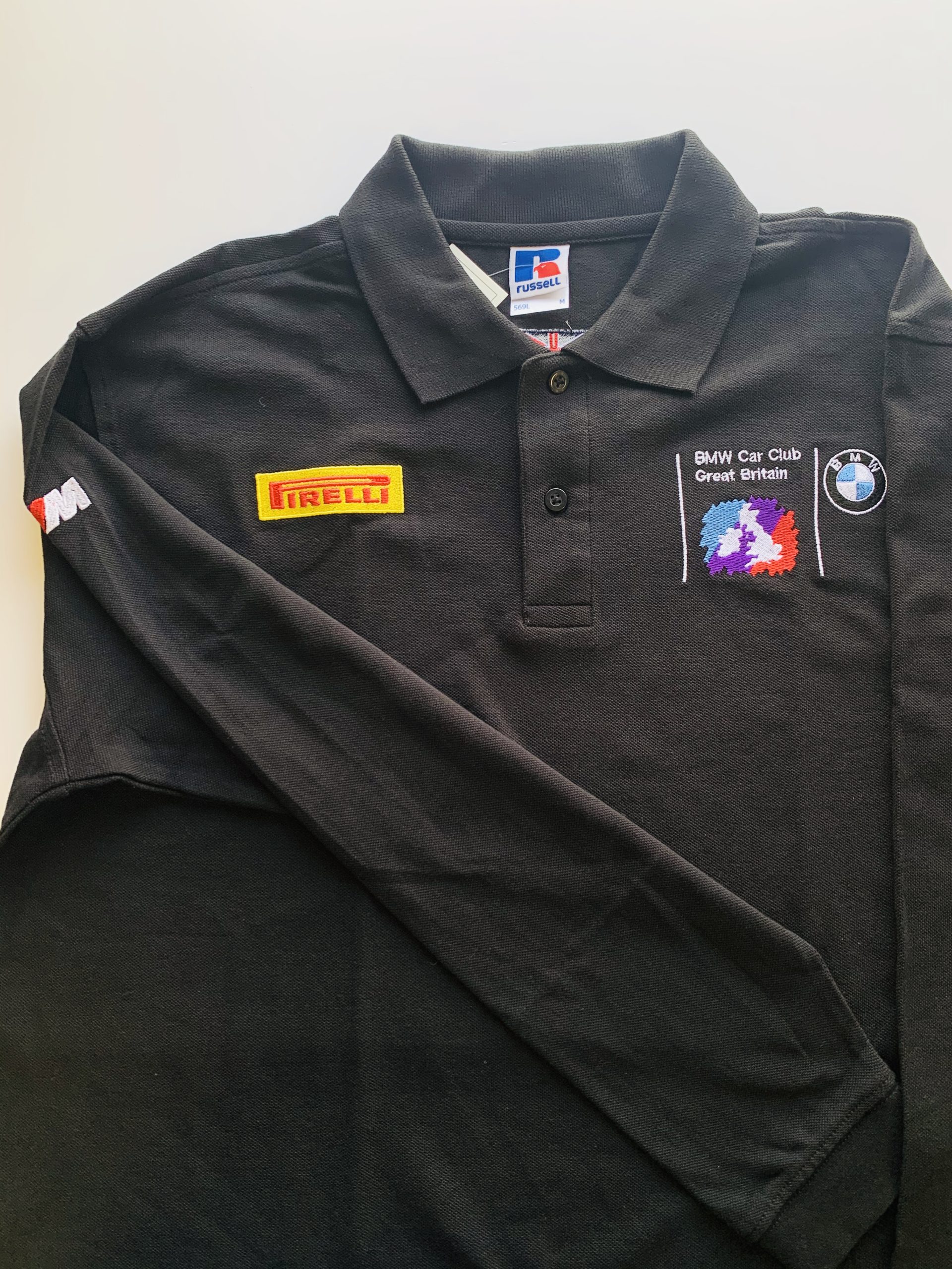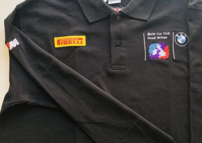 Embroidered with BMW Car Club logo on left chest, Pirelli Logo on right chest, Union Jack on the back, and M Power logo on the right sleeve.